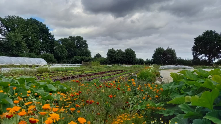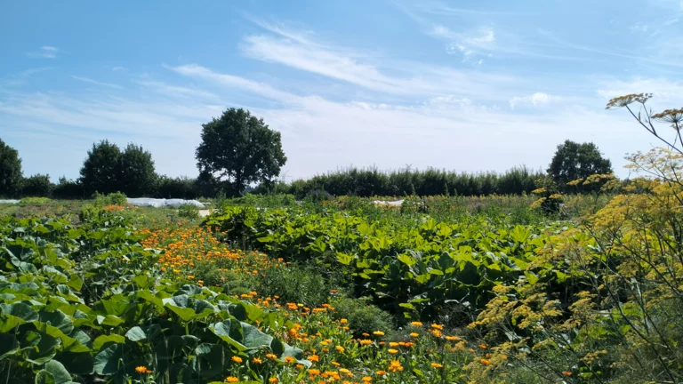 Große Mischkultur aus vielen Gemüsesorten und Blühstreifen