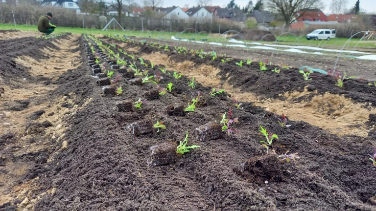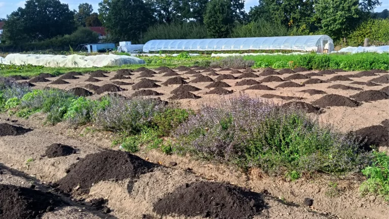 Damit die Jungpflanzen weiter gut gedeihen und wachsen können, benötigen sie einen gesunden Boden. Als wir mit der KiWi angefangen haben, war der Boden humusarm, sehr sandig und reich an Steinen. Um den Boden und sein Microbiom zu beleben, setzten wir viele verschiedene Maßnahmen jährlich um: