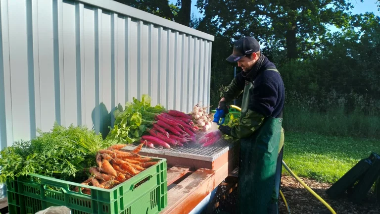 Durch unsere große Gemüsevielfalt haben wir eine abwechslungsreiche Ernte über die Saison. Wir waschen und bündeln das Gemüse direkt am Feld und bereiten es für Euch vor.