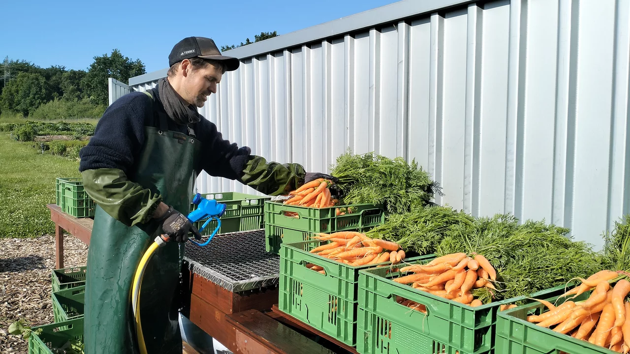 Kurze Wege und Qualität sind uns wichtig, deshalb ernten und waschen wir unser Gemüse direkt am Feld vor der Ausgabe.